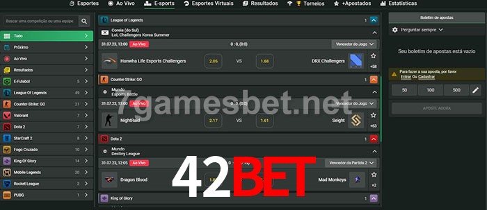 O 42bet oferece uma grande seleção de opções de apostas em e-sports com probabilidades competitivas